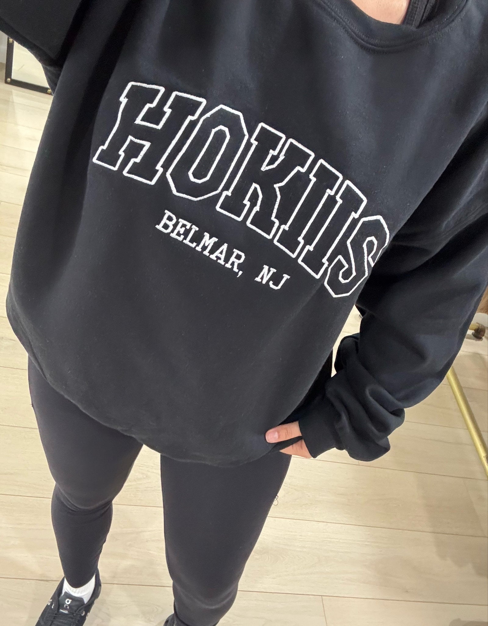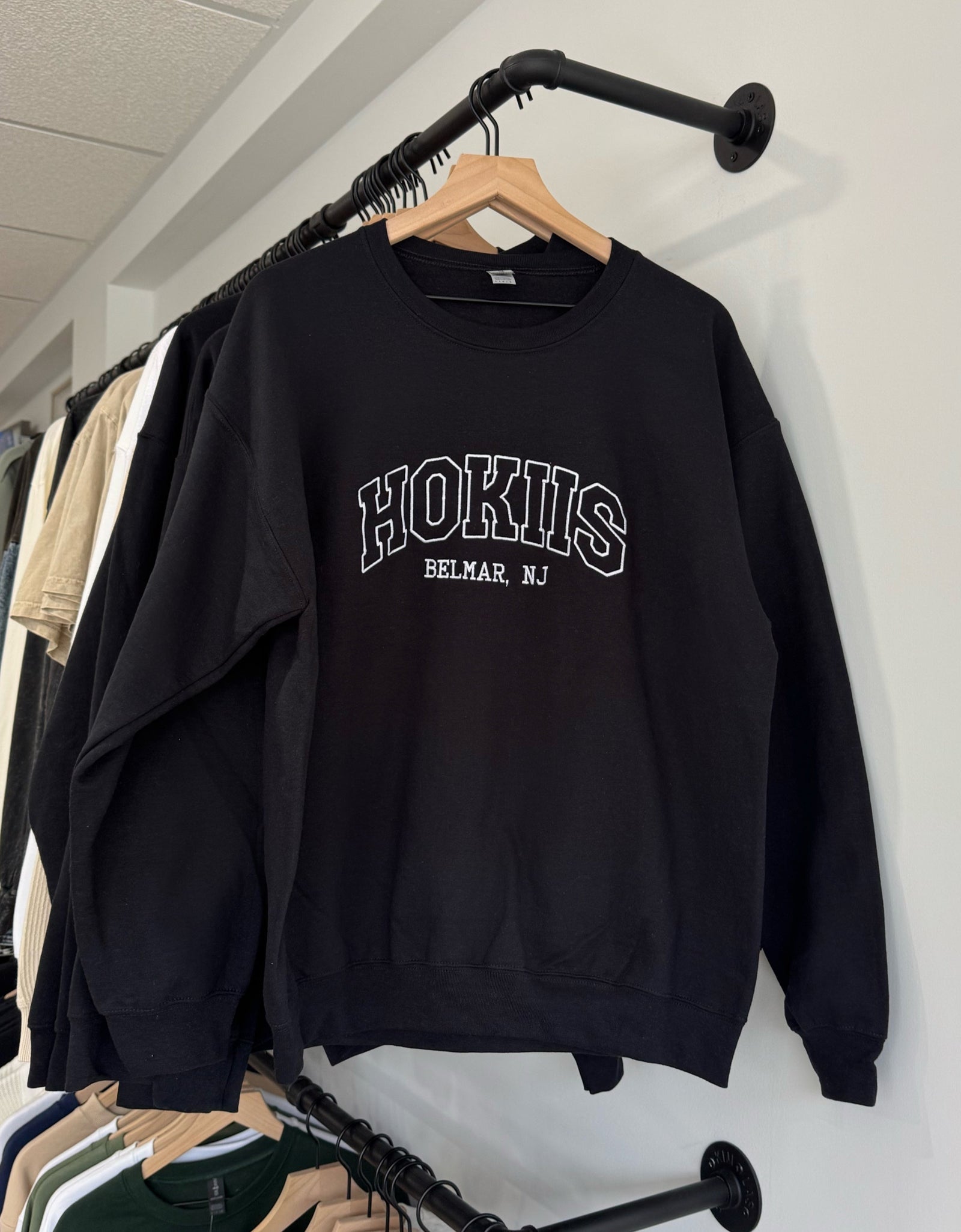 - 'HOKIIS, BELMAR NJ' embroidered black oversized crewneck sweatshirt